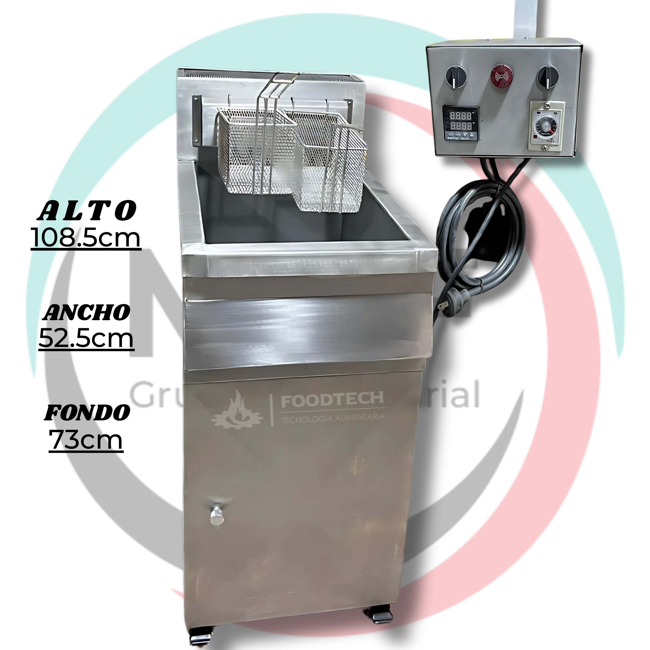 Fabricada en acero inoxidable 304 antiácido quirúrgico, esta freidora garantiza durabilidad, higiene y resistencia ante el uso intensivo. Su diseño incluye doble canastilla, ideal para preparar dos productos simultáneamente, maximizando el tiempo de trabajo.
