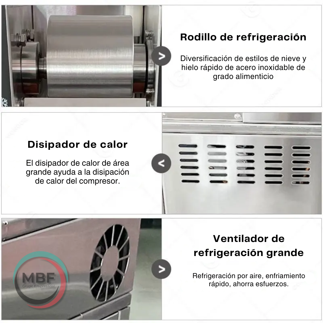 - Enfriamiento rápido: Su avanzado sistema de refrigeración garantiza que la máquina esté lista para usarse en pocos minutos, permitiendo la producción continua de hielo finamente rallado y manteniendo una textura suave y cremosa, perfecta para el Bingsu. Esto asegura que siempre puedas ofrecer a tus clientes productos de alta calidad sin largos tiempos de espera.